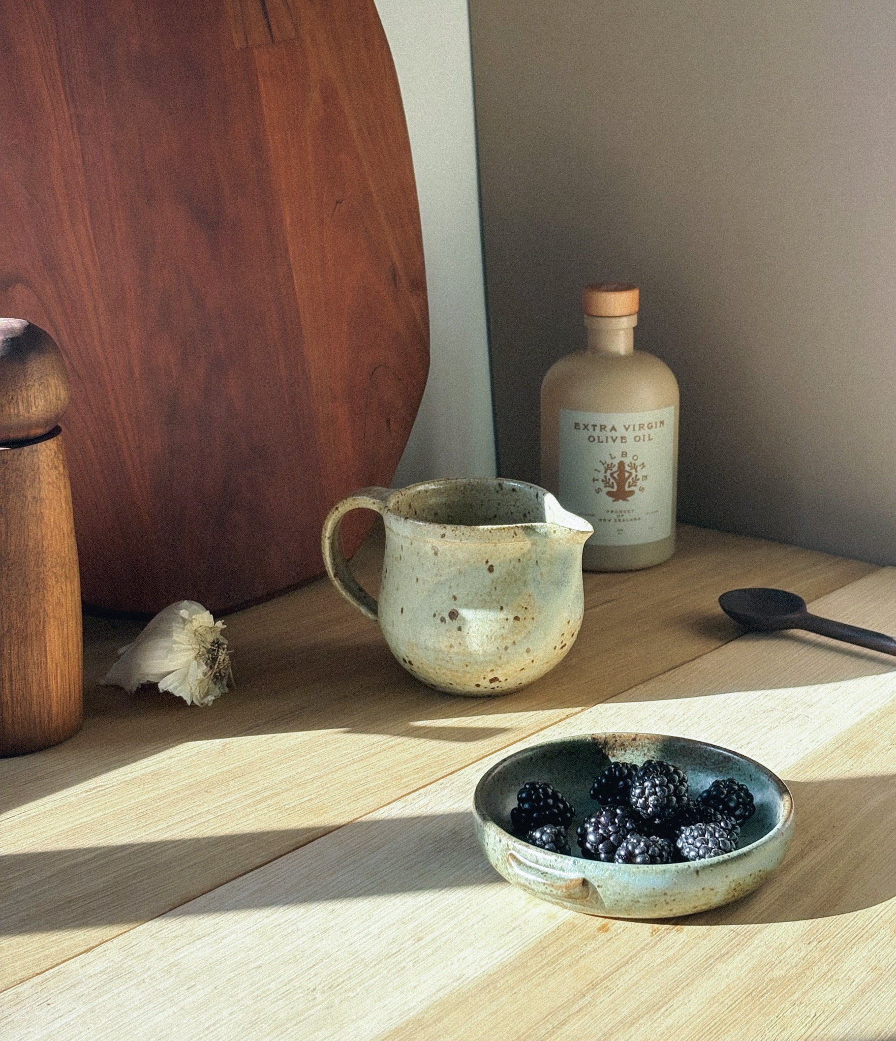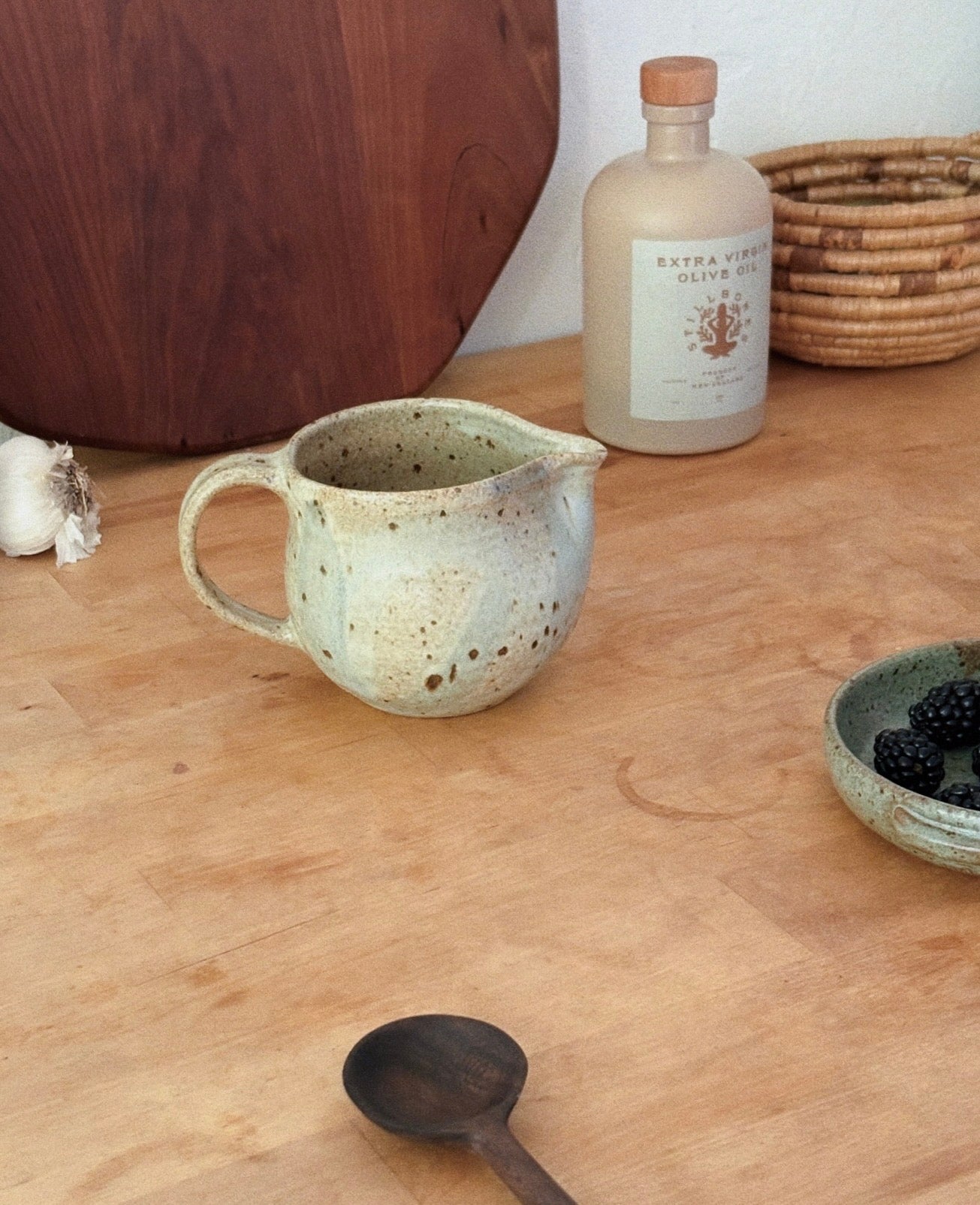 Transform the rhythm of everyday cooking into a quiet ritual with our Earthen Salad Dressing Pitcher. Thoughtfully sized for dressings, sauces, or marinades, each pitcher is crafted with a small spout and shaped to fit comfortably in hand. Designed with stirring, mixing, and slow cooking practices in mind, it’s a piece meant to be held, passed, and used often. Even the humblest objects in the kitchen - like vessels for mixing herbs, whisking together a vinaigrette, and pouring over garden greens - can become a place to pause, appreciate, and connect with the present.